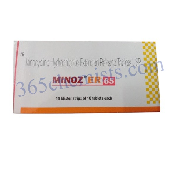 The antibiotic drug Minoz ER 65 mg Tablet (minocycline 65mg) is used to treat a variety of bacterial infections. It stops the growth and reproduction of bacteria. Be sure to take the medication as directed, finish the entire course of therapy, and be informed of any potential side effects or precautions. Consult your healthcare professional if you have any worries or inquiries for more advice and details.
