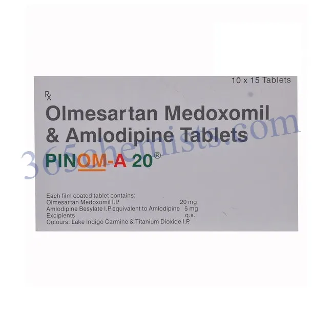 - Olmesartan Medoxomil and Amlodipine in the Pinom A 20mg Tablet work in concert to produce synergistic effects. Compared to taking each medication separately, their combined effects on blood vessels result in a greater reduction in blood pressure. Pinom A 20 mg Tablet is a strong option for those who have hypertension because of this.