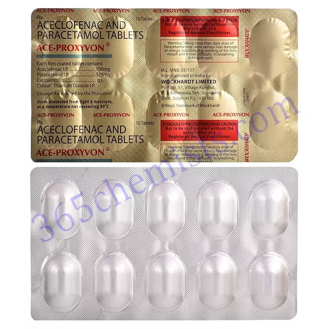 Aceclofenac is the active component in each Ace Proxyvon 100mg Tablet, and there is 100mg of this component in each tablet. Aceclofenac is a non-steroidal anti-inflammatory drug (NSAID) that is well-known for both its pain-relieving (analgesic) and anti-inflammatory (anti-inflammatory) properties. It belongs to the class of drugs known as non-steroidal anti-inflammatory drugs.
