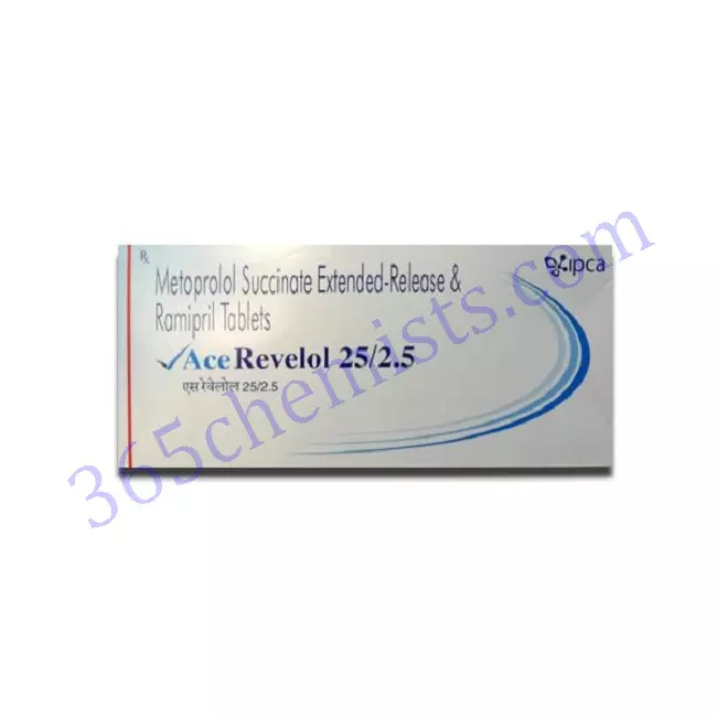 Metoprolol Succinate and Ramipril come together in the combination drug known as Ace Revelol 25/2.5mg Tablet, which is indicated for the control of hypertension. The Ace Revelol 25/2.5mg Tablet helps to decrease blood pressure and enhance cardiovascular health by combining two different types of medications: a beta-blocker and an ACE inhibitor. Achieving optimal control of hypertension with Ace Revelol 25/2.5mg Tablet treatment requires strict adherence to the recommended dosage, consistent monitoring of blood pressure, and open and frequent communication with the treating healthcare professional.