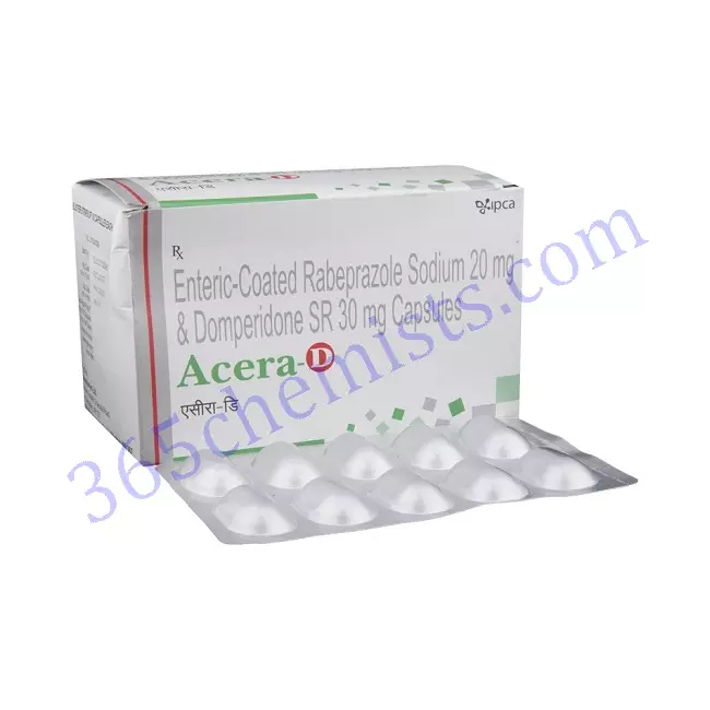 Acera-D CAPSULE is a gastrointestinal medicine composed of Rabeprazole (stomach acid reducer) and Domperidone (nausea/vomiting reducer). Together they reduce the amount of acid your stomach makes and decrease the symptoms of nausea and vomiting. It treats symptoms of acid reflux due to hyperacidity, stomach ulcer (Peptic ulcer disease), and Zollinger Ellison syndrome (overproduction of acid due to a pancreatic tumour). Besides this which is used short-term to treat symptoms of gastroesophageal reflux disease (GERD).