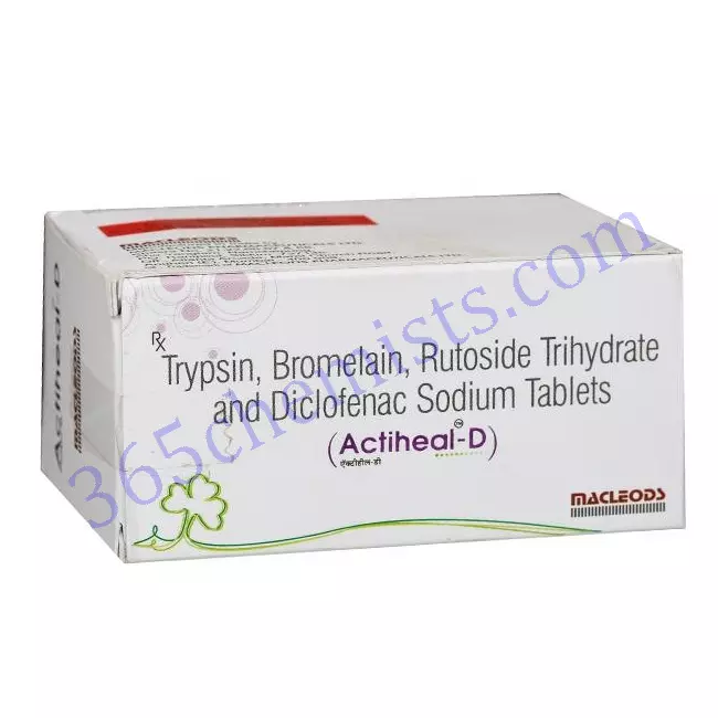 Actiheal D Tablet contains Trypsin, Bromelain, and Rutoside as its active ingredients. Trypsin is a proteolytic enzyme that aids in the breakdown of proteins, facilitating tissue repair and regeneration. Bromelain, derived from pineapple, possesses anti-inflammatory properties and helps reduce swelling and pain. Rutoside, also known as Rutin, is a bioflavonoid that enhances the strength and integrity of blood vessels, promoting healthy circulation and reducing edema.