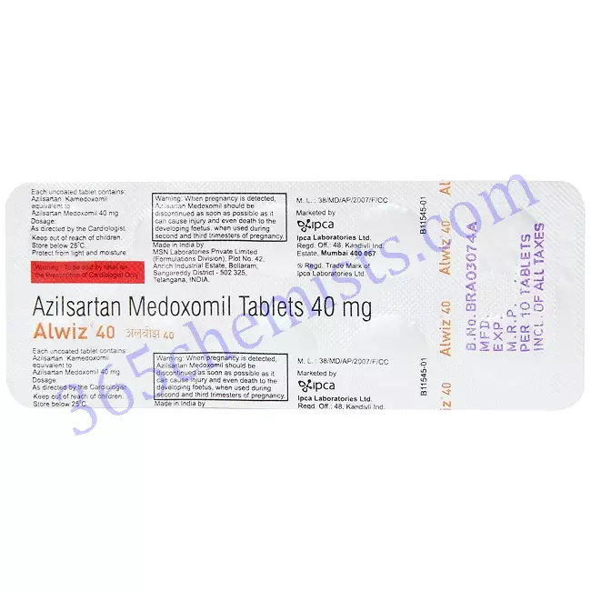 A treatment for hypertension (also known as high blood pressure), the drug known as Alwiz 40 Tablet (Azilsartan medoxomil 40mg) is available in tablet form. Because it inhibits the activity of angiotensin II, the Alwiz 40 Tablet contributes to the relaxation and dilation of blood vessels, which ultimately leads to a drop in blood pressure. It is essential for the safe and efficient use of Alwiz 40 Tablet to strictly adhere to the recommended dosage, maintain regular monitoring of blood pressure, and maintain open and honest contact with the treating healthcare practitioner. The management of hypertension and the monitoring of treatment response and side effects are both extremely important tasks that fall under the purview of healthcare professionals.