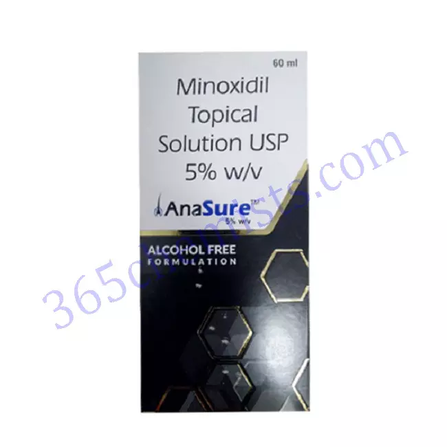 Anasure 5% Solution is a medicine used to treat common hereditary hair loss. It can prevent further hair loss and help hair to re-grow. It works by increasing blood flow to the hair follicles on your scalp, which prevents hair cell death and also enhances new hair growth. It is most effective for baldness or thinning at the top of the scalp but less effective at the front or for receding hairline.