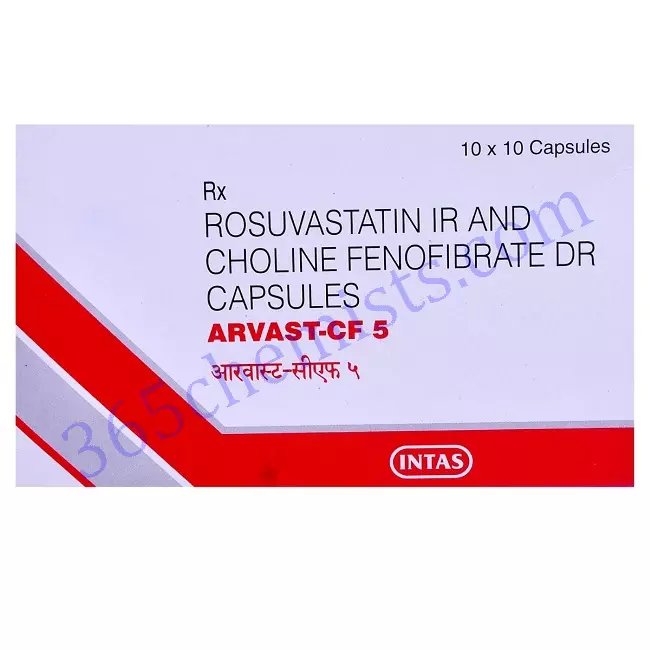 The combination of fenofibrate and rosuvastatin included in the Arvast-CF 5 Capsule makes it an effective medication for the treatment of cholesterol levels. Its dual-action mechanism, which combines a fibric acid derivative with a statin, contributes to the reduction of LDL cholesterol, triglycerides, and total cholesterol while simultaneously contributing to an increase in HDL cholesterol levels. Individuals who suffer from mixed dyslipidemia are excellent candidates for treatment with Arvast-CF 5 Capsule. Arvast-CF 5 Capsule assists patients in achieving and maintaining optimal cholesterol levels, hence enhancing the health of their cardiovascular systems when combined with routine monitoring and counselling from medical professionals. It is essential to adhere to the suggested dosage, maintain a healthy lifestyle, and go in for frequent cholesterol examinations if one wishes to successfully manage their cholesterol levels. Arvast-CF 5 Capsule is an important tool that helps people take control of their cholesterol levels and improve their cardiovascular health overall. This is a role that Arvast-CF 5 Capsule plays very well.