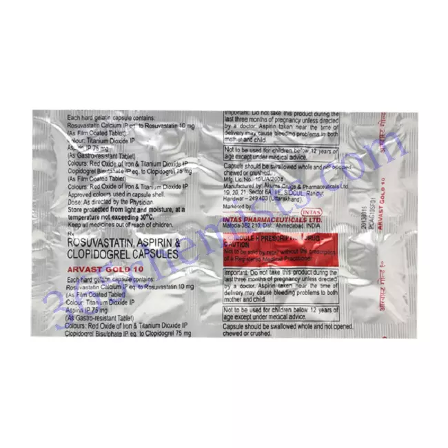 - total Cardiovascular Protection: The Arvast Gold 10 Capsule provides total cardiovascular protection by combining the benefits of aspirin and rosuvastatin. While aspirin, with its antiplatelet qualities, lowers the risk of blood clot formation, rosuvastatin lowers levels of LDL cholesterol and prevents plaque building in the arteries. Both of these effects are beneficial to cardiovascular health. The risk of cardiovascular events including heart attacks and strokes is dramatically lowered thanks to this dual-action mechanism.