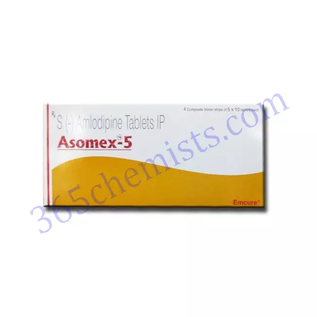 Asomex 5mg Tablet 15’s contains ‘S-amlodipine’, a calcium channel blocker that acts by relaxing the blood vessels. This reduces the heart’s workload and makes the heart more efficient at pumping blood throughout the body. Thus, it helps to lower high blood pressure, reducing the chances of heart attack or stroke.