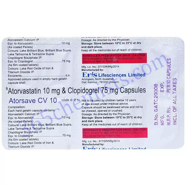 It is crucial to inform your healthcare practitioner about any pre-existing medical conditions, ongoing drugs, or allergies prior to beginning treatment with Atorsave CV 10 Capsule. Clopidogrel has the potential to interact negatively with a number of different drugs, including proton pump inhibitors and certain antidepressants. In addition, people who have particular genetic mutations may not react favourably to Clopidogrel, in which case it is possible that alternative treatments may be examined. Your healthcare practitioner will evaluate the possible downsides and upsides of using Atorsave CV 10 Capsule in relation to your unique circumstances.