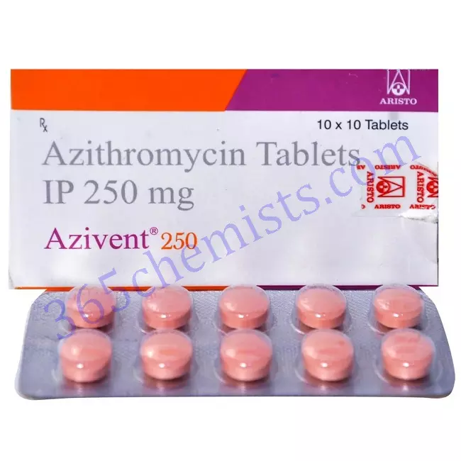 Azithromycin serves as the primary ingredient in the formulation of the antibiotic known as Azivent 250 Tablet, which belongs to the macrolide class. Oral administration, such as that provided by this tablet, is a straightforward and uncomplicated method that makes the product user-friendly. The active component, azithromycin, works by inhibiting the growth and multiplication of bacteria. This allows it to effectively treat a wide variety of bacterial illnesses.