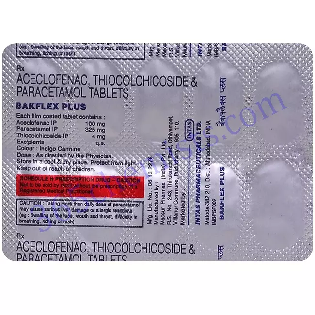 - Bakflex Plus Tablet contains a component called thiocolchicoside, which is a muscle relaxant that helps to alleviate muscle spasms and stiffness. Through the facilitation of muscle relaxation, it contributes to the alleviation of discomfort and the enhancement of flexibility, thereby enabling individuals to experience improved mobility and range of motion.