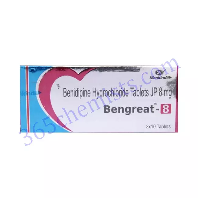 Bengreat 8mg Tablet belongs to a class of medicines called calcium channel blockers, which is primarily used to treat hypertension (high blood pressure) and angina-pectoris(chest pain). Hypertension (high blood pressure)Bengreat 8mg Tablet is a lifelong or chronic condition in which the blood pressure against the artery walls becomes high. Angina-pectoris is a type of chest pain caused by reduced blood flow to the heart.