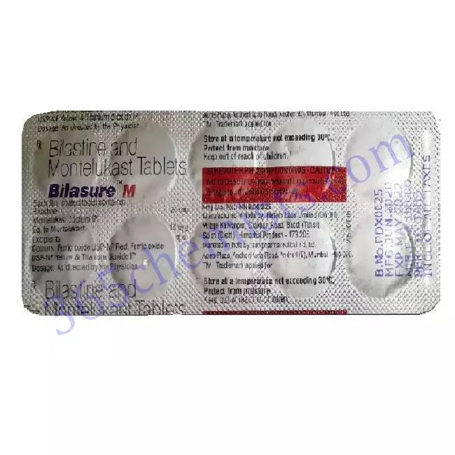 Bilasure M Tablet is a combination of Bilastine and Montelukast. This medicine is used to relieve allergy symptoms like runny nose, sneezing, redness of your nose, watery eyes, itching, rash etc. It stops the action of a natural substance called histamine produced in your body during an allergic reaction.