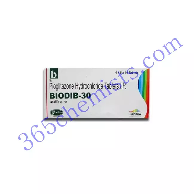 The drug Biodib 30mg Tablet is a member of the thiazolidinediones drug class. It functions by making the body more sensitive to the hormone insulin, which controls blood sugar levels. Biodib 30mg Tablet decreases the quantity of glucose produced by the liver and increases insulin sensitivity, enabling the body to use glucose more effectively. As a result, blood sugar levels are better managed.
