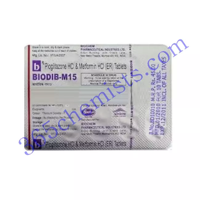 A combination drug called Biodib-M15 Tablet is used to treat type 2 diabetes mellitus. Pioglitazone and metformin, two of its two main ingredients, collaborate to treat diabetics with blood sugar regulation. The uses, dosage, warnings, and potential adverse effects of Biodib-M15 Tablet will all be covered in this overview.