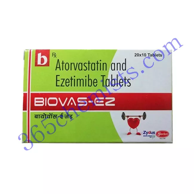 A powerful combination medicine for the management of high cholesterol levels, Biovas EZ Tablet contains 10 milligrammes of both atorvastatin and ezetimibe, each of which is 10 milligrammes. Biovas EZ Tablet provides a complete strategy to improving lipid profiles and reducing the risk of cardiovascular illnesses like heart disease and stroke by combining the cholesterol-lowering actions of both of the drugs. Patients who need their cholesterol managed would benefit greatly from using this medicine because of its increased efficacy, safety, and tolerability. In order to get started on the path to better heart health, you should first check with a medical expert to see if the Biovas EZ Tablet is appropriate for the requirements that are unique to your situation.