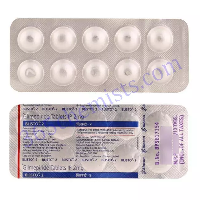 An oral diabetes medication called Blisto 2 mg Tablet is used to treat type 2 diabetes mellitus. By promoting the synthesis of insulin and enhancing insulin sensitivity, it aids in blood sugar regulation. To obtain the best possible diabetes control, it’s crucial to adhere to your doctor’s recommendations, lead a healthy lifestyle, and frequently check your blood sugar levels. Ask your healthcare practitioner for advice if you notice any unsettling side effects or have any questions or concerns. They will offer you individualised guidance based on your unique needs and assist you in improving your diabetes control.