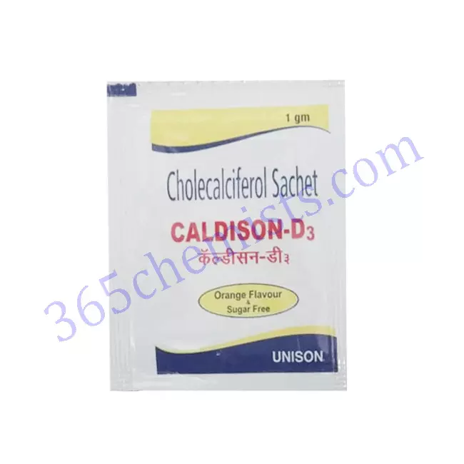 Caldison D 3 Sachet is used to treat vitamin D deficiency, support bone strength, and improve calcium absorption.