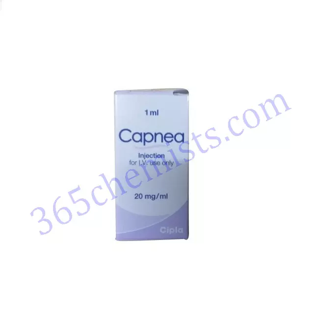 This medicine primarily work as a Central nervous system stimulant. It is used in the treatment of idiopathic apnea of prematurity. Has several advantages over theophylline in the treatment of neonatal apnea, its half-life is about 3 times as long, allowing once daily dosing, drug levels do not need to be drawn at peak and trough. Capnea 20mg/1ml Injection has a wider therapeutic window, allowing more room between an effective concentration and toxicity.