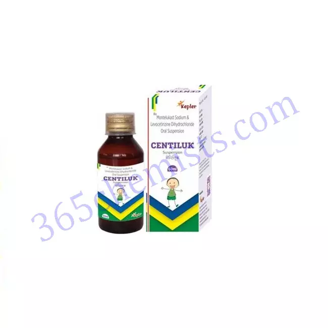 Centiluk Suspension is a combination medicine that contains Levocetirizine and Montelukast. It is a very effective and potent medication used in children to treat year-round allergic symptoms like runny nose, watery eyes, sneezing, itching, hives (itchy, painful eruptions that sting), etc. This is a widely used combination medicine in providing relief from blockage of the nose.