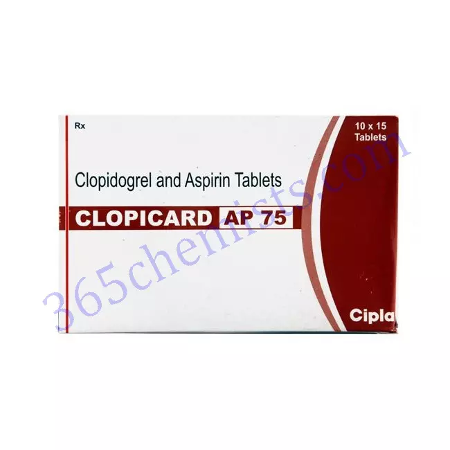 Clopicard AP 75 is a combination of Aspirin and Clopidogrel which belongs to the group of medicines called Antiplatelets. Clopicard AP 75 MG is used in the prevention of early and long-term atherothrombotic events such as myocardial infarction (also known as heart attack), stroke (reduced blood supply to brain leading to brain death), cardiovascular death, or refractory ischemia (chest pain due to inadequate blood supply to the heart) in patients having acute coronary syndrome with or without cardiac revascularization (including surgical or PCI, with or without stent insertion). Acute coronary syndrome is a heart condition caused by plaque rupture or clot formation in the coronary arteries. Symptoms include heart attack, chest pressure or pain while at rest, shortness of breath and sweating.