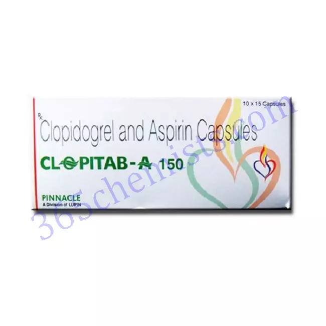 One capsule of the pharmaceutical known as Clopitab-A 150 contains both aspirin and clopidogrel, which are both considered to be active components of the drug. This combination medication is utilised frequently in the treatment and prevention of cardiovascular disorders, particularly those that involve the aggregation of platelets in the blood and the production of blood clots. The improved antiplatelet effects provided by Clopitab-A 150 Capsule are achieved by targeting various pathways that are involved in platelet function. As a result, the risk of cardiovascular events is decreased.