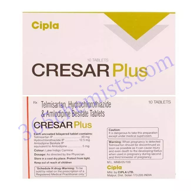 Cresar Plus Tablet is a combination drug that is used for the management of hypertension. One tablet of Cresar Plus Tablet contains amlodipine 5 mg and hydrochlorothiazide 12.5 mg. It helps achieve better control of blood pressure levels and minimises the risk of problems associated with high blood pressure by combining the actions of Amlodipine and Hydrochlorothiazide, both of which have been shown to lower blood pressure. Nevertheless, it is essential to take this drug exactly as directed, to be aware of the possibility of unpleasant side effects, and to exercise the necessary level of caution while doing so. Monitoring and follow-up appointments with a healthcare professional at regular intervals are essential in order to evaluate the patient’s reaction to therapy and identify any potential adverse effects. Always seek the advice and direction of a qualified medical practitioner for specific recommendations and instructions regarding the use of Cresar Plus Tablet in your particular circumstances.