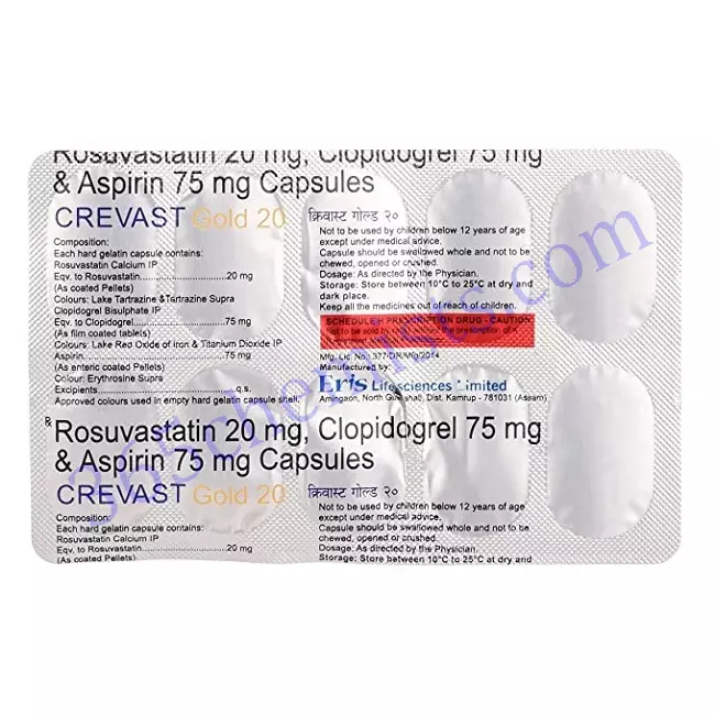 CREVAST GOLD 20MG CAPSULE 10’S is a fixed-dose combination composed of three medicines, namely, Rosuvastatin, Clopidogrel, and Aspirin. Rosuvastatin belongs to a group of drugs known as antihyperlipidemic. Rosuvastatin lowers the level of lipid. It blocks the ability of the body to produce bad cholesterol and improves the ability of the body to produce good cholesterol. Clopidogrel and aspirin both belong to a group of drugs known as Antiplatelet. They work by preventing the blood from sticking together and decrease the production of clots which is harmful to the body. Altogether CREVAST GOLD 20MG CAPSULE 10’S help to reduce the risk of heart attack, stroke and heart-related chest pain (angina).