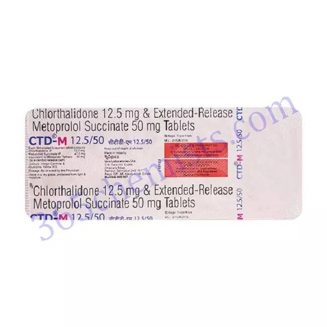 Metoprolol Succinate and Chlorthalidone are the two active components that are used in the formulation of the prescription drug known as CTD-M 12.5mg/50mg Tablet. The primary application for this medication is the management of hypertension, which is another name for high blood pressure. Metoprolol Succinate is classified as a beta-blocker, whereas chlorthalidone is a thiazide-like diuretic. Both of these medications are used to treat hypertension. These factors, when combined, have a synergistic effect that leads to a reduction in blood pressure and assists in keeping it within a healthy range.