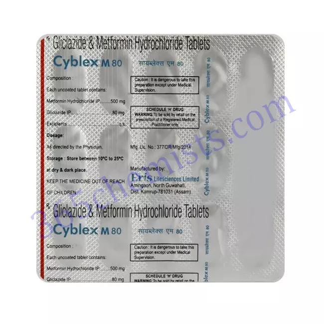 Gliclazide and metformin are the two active components of the drug Cyblex M 80mg Tablet. For the management of type 2 diabetes mellitus, it is frequently recommended. The combination drug provides a thorough method for reducing blood sugar levels and enhancing glycemic control. Metformin is a biguanide, and Gliclazide is a sulfonylurea. Together, they support the management of type 2 diabetes by regulating glucose levels and acting synergistically.