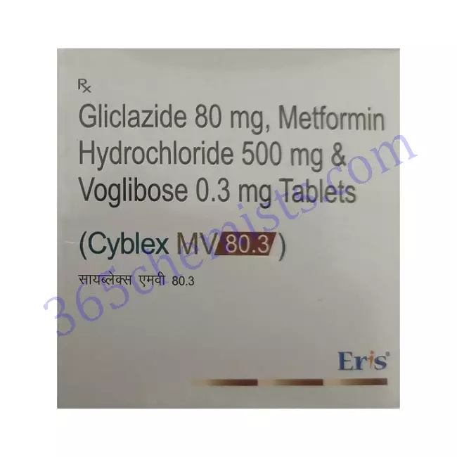 A drug called Cyblex MV 80.3mg Tablet contains the active chemicals Voglibose, Metformin, and Gliclazide. For the management of type 2 diabetes mellitus, it is frequently recommended. This combo drug improves glycemic control and regulates blood sugar levels by focusing on various components of diabetes management. Voglibose is an alpha-glucosidase inhibitor, while Gliclazide is a sulfonylurea and Metformin is a biguanide. Together, they offer a thorough plan for managing diabetes and help to keep blood sugar levels steady.