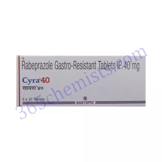 - Relieving Symptoms Associated with Acid: Acid-related problems including heartburn, indigestion, and a sour taste in the mouth can be relieved with Cyra 40 mg Tablet. It helps avoid the recurrence of these symptoms by lowering stomach acid production, letting people to go about their regular lives without experiencing the discomfort brought on by too much stomach acid.