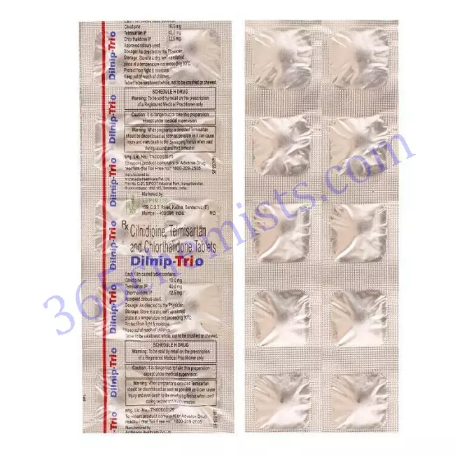 Oral tablets of Dilnip Trio 12.5mg Tablet are available and should be taken exactly as directed by a healthcare provider. Depending on the patient’s condition, age, and general health, the dosage may change. Usually, it is taken once per day, ideally at the same time every day, with or without food. Do not crush or chew the tablet; instead, swallow it whole with a glass of water.