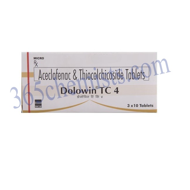 The active ingredients in the combination medication known as Dolowin TC 4 Tablet are the analgesics aceclofenac and the anti-inflammatory substance known as thiocolchicoside. The pain and muscle spasms that are associated with musculoskeletal conditions can be effectively alleviated by using this medication as it has been specially formulated to do so. Dolowin TC 4 Tablet helps to alleviate discomfort, improve mobility, and enhance overall well-being thanks to its approach that combines two different types of action.
