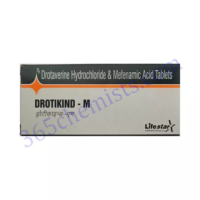 DrotikindM Tablet 10’s is a combination of two drugs, namely: Drotaverine and Mefenamic acid. DrotikindM Tablet 10’s is used to treat abdominal pain, muscle pain, migraine headache, functional bowel disorders, dysmenorrhea (menstrual cramps), heavy bleeding during periods, renal colic pain, and pain after surgery. Drotaverine is an antispasmodic that reduces calcium reuptake by the cells, thereby correcting the calcium levels in the body and relieves contractions associated with smooth muscles. Mefenamic acid is an NSAID which works by blocking the effect of a chemical messenger in the body, known as cyclo-oxygenase (COX) enzymes that make another chemical prostaglandin (PG). These prostaglandins are produced at injury sites and cause pain and swelling. By blocking COX enzymes’ effect, lesser PGs are produced, which reduces mild to moderate pain and inflammation at the injured or damaged site. Together, DrotikindM Tablet 10’s helps in relieving pain.