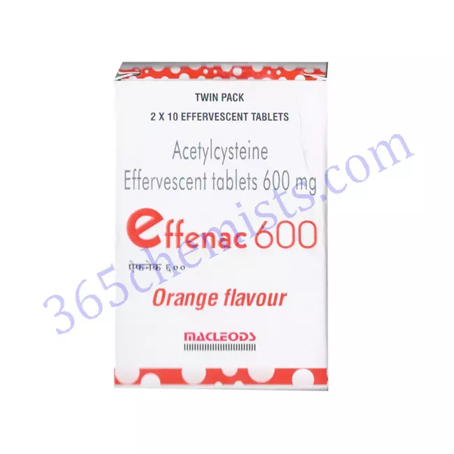 Effenac 600mg Orange Effervescent Tablet 10’s is a mucolytic agent (sputum thinner) used to treat acute (short term) and chronic (long term) respiratory diseases associated with excess mucus. Effenac 600 Orange Effervescent Tablet 10’s helps in making cough less viscous so that it can be coughed out easily in the conditions of acute and recurrent bronchitis (airways infection), laryngitis (voice box infection) and tracheitis (windpipe infection) and chronic diseases like chronic bronchitis and chronic obstructive pulmonary disease (COPD). Thus, helps in thinning and loosening phlegm (mucus) in lungs, windpipe and nose to cough out easily and provide relief from symptoms such as wheezing, coughing, tightness in chest and shortness of breath. Also, Effenac 600 Orange Effervescent Tablet 10’s in injection form works as an antidote in paracetamol overdose by restoring the body’s glutathione ( antioxidant produced in cells), a chemical that eliminates toxic substances.