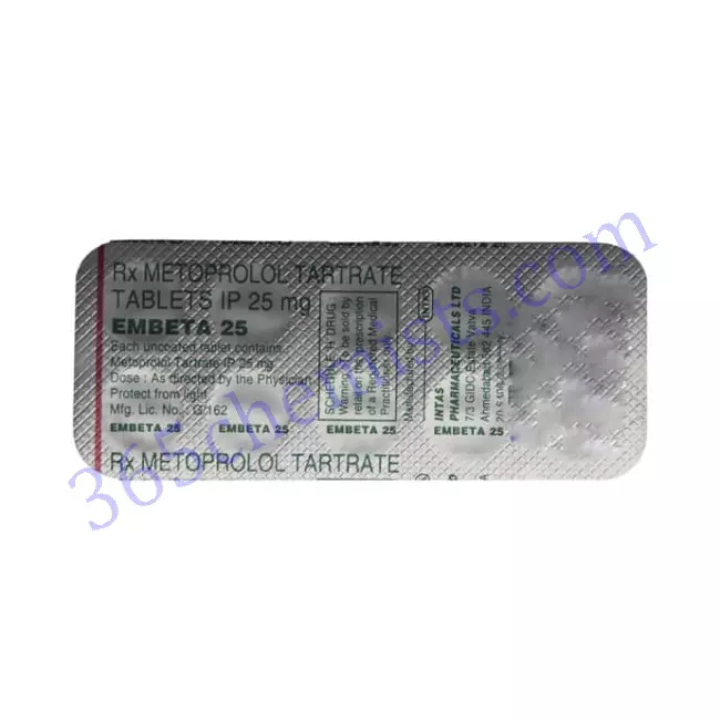 Metoprolol Tartrate serves as the active component of the drug Embeta 25mg Tablet. It is a member of the beta-blocker class and is typically prescribed to treat different cardiovascular conditions. Embeta 25mg Tablet is used to treat angina (chest pain), certain heart rhythm disorders, and hypertension (high blood pressure).