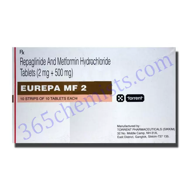 A combination drug called Eurepa MF 2mg/500mg Tablet is used to treat type 2 diabetes mellitus. Repaglinide and metformin are its two active components. Repaglinide is a member of the meglitinide drug class, whereas biguanides include Metformin. This combination has complementary modes of action to aid in glycemic management and blood sugar regulation in diabetics.