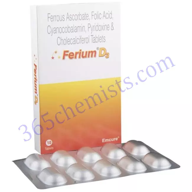 Folic acid, cholecalciferol (also known as vitamin D3), cyanocobalamin (also known as vitamin B12), and pyridoxine (also known as vitamin B6) are all components of the dietary supplement known as Ferium D3 Tablet. Folic acid is also present in this product. Individuals who are looking to support bone health, enhance energy levels, and promote overall well-being may benefit from taking this tablet, which has been formulated to provide essential nutrients. The Ferium D3 Tablet provides an easy way to ensure that your levels of vitamins and minerals are always at their optimal level thanks to the targeted approach it takes to providing nutritional support.