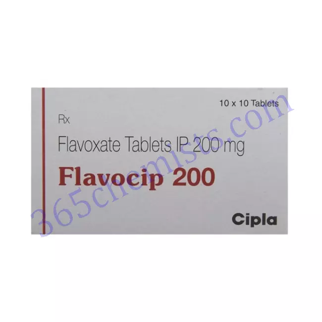 A medication called Flavocip 200mg Tablet is used to treat urinary bladder problems and the symptoms that are associated with those problems. It accomplishes this by calming the spasms that can occur in the muscles of the bladder and by relaxing those muscles. Be sure to take the medication in the correct quantity and observe all of the safety precautions that have been outlined, and tell your doctor about any allergies or pre-existing conditions you have. If you experience any side effects that make you concerned, you should stop taking Flavocip 200mg Tablet immediately and contact a medical professional.