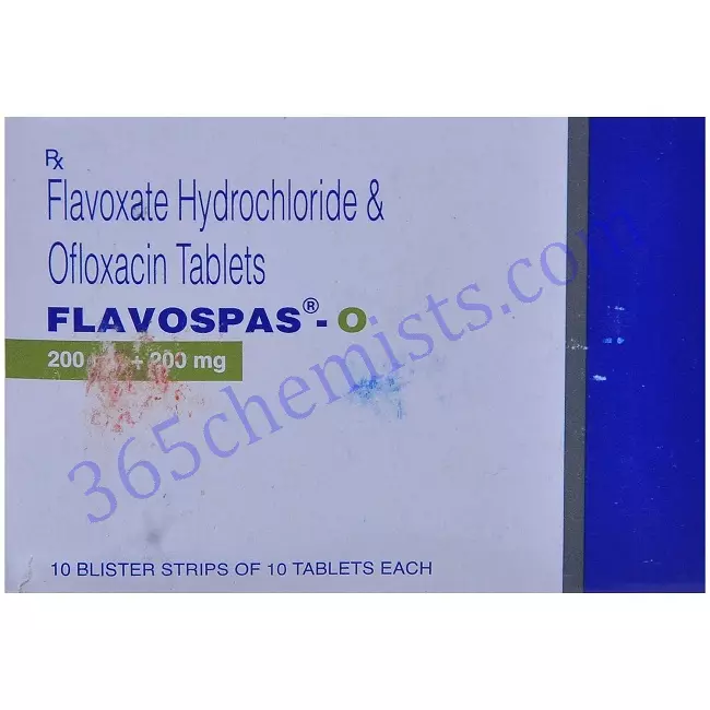 Flavospas-O offers two benefits by combining the qualities of two drugs. The fluoroquinolone antibiotic class includes ofloxacin. It functions by preventing the development and spread of the germs that cause urinary tract infections. of contrast, the antispasmodic drug flavoxate relaxes the muscles of the urinary system. By easing bladder spasms, this aids in reducing urine frequency, urgency, and incontinence.