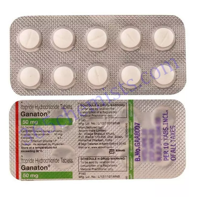 Ganaton 50 MG Tablet is used to increase the mobility of food in the stomach and intestine. It is used for the treatment of gastrointestinal symptoms such as abdominal pain, loss of appetite, heartburn, nausea, vomiting, etc. associated with gastroesophageal reflux disease, functional dyspepsia, and other associated motility disorders.