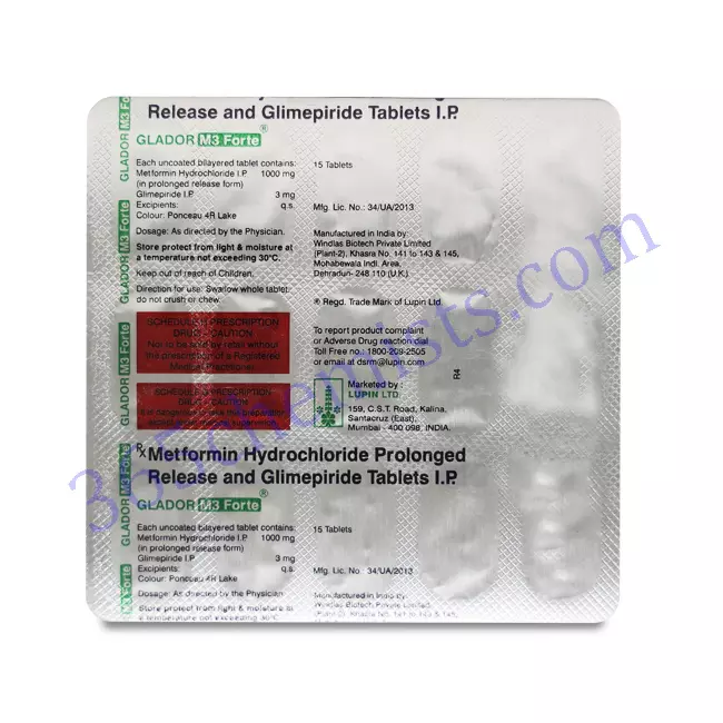 Glimepiride and metformin are both ingredients in the Glador M3 Forte Tablet. For the management of type 2 diabetes mellitus, it is frequently recommended. The Glador M3 Forte Tablet is covered in detail in this thorough reference, including its ingredients, mechanism of action, applications, dosage, side effects, precautions, and more.