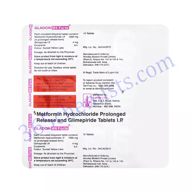 A combination drug called Glador M4 Forte Tablet (glimepiride/metformin) is used to treat type 2 diabetes mellitus. It helps regulate blood sugar levels, enhance insulin sensitivity, and lower the risk of complications related to diabetes by combining the benefits of glimepiride with metformin. Follow the dosage instructions, keep a regular eye on your blood sugar levels, and maintain a healthy lifestyle. Keep in touch with your doctor, go in for routine checkups, and be informed of any possible side effects or precautions. Glador M4 Forte Tablet can considerably aid in the effective treatment of type 2 diabetes and advance your general well-being when used and managed properly.