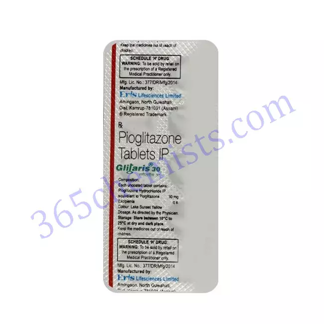 - The effect of pioglitazone, the substance that makes up Glitaris 30 mg Tablet, is to lessen the need for exogenous insulin by enhancing insulin sensitivity. In certain people, it reduces the need for extra insulin injections by maximising the body’s natural insulin synthesis and utilisation. This insulin-sparing action offers a different type of treatment for controlling diabetes.