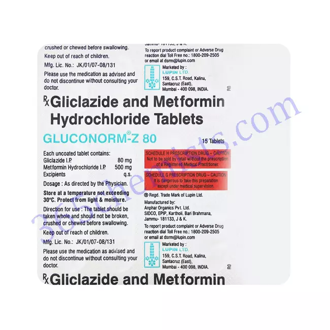 - Metformin, the other component of the Gluconorm-Z 80/500mg Tablet, is responsible for the reduction in glucose synthesis in the liver. It does this by inhibiting the creation of glucose in excess, which in turn helps bring down blood sugar levels and adds to better glycemic control. The effect of increased insulin secretion is complemented by this mechanism’s mode of action.