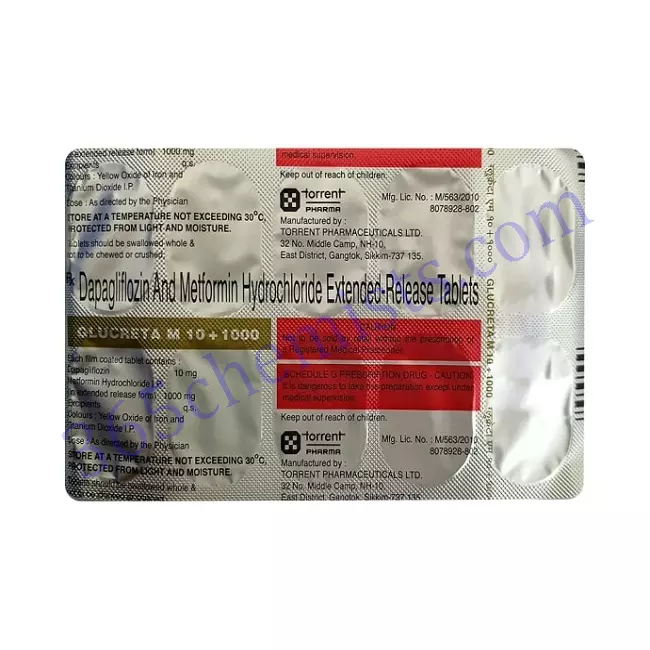 Glucreta M 10/1000mg Tablet is an effective drug for the management of type 2 diabetes mellitus. This medication contains the combination of dapagliflozin and metformin. It offers enhanced glycemic control, benefits for weight loss, and the ease of only having to take a single tablet thanks to the combination of the activities of these two medications. In order to use Glucreta M 10/1000mg Tablet in a manner that is both safe and effective, it is essential to strictly adhere to the recommended dosage, carefully follow the directions provided by the healthcare expert, and be aware of any potential adverse effects as well as safety precautions. Individuals who have type 2 diabetes continue to have access to a vital treatment choice in the form of Glucreta M 10/1000mg Tablet because of its efficacy, which has been scientifically demonstrated, as well as the synergistic effects of its active ingredients, which promote patients’ general health and well-being.
