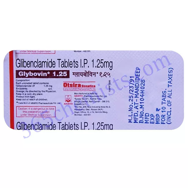 Glibenclamide is the active ingredient in the medication Glybovin 1.25 mg Tablet, which makes it an effective medication for managing blood sugar levels in people who have type 2 diabetes. Glybovin helps maintain optimal blood glucose control and reduces the risk of diabetes-related complications. It does this by stimulating insulin secretion and improving glucose utilisation. Be sure to follow the instructions for the dosage that is recommended, keep a close eye on your blood sugar levels at all times, and talk to your healthcare provider for individualised guidance and support. You will be able to take more active steps towards achieving better glycemic control and living a life that is both healthier and more fulfilling when you use Glybovin.