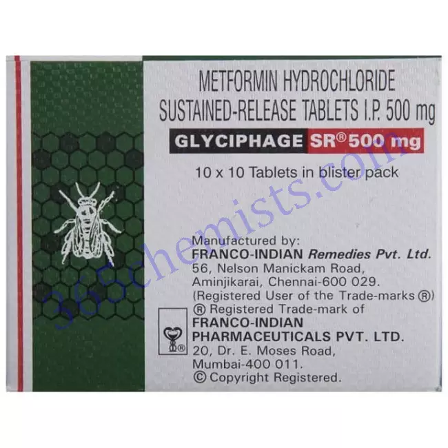 Metformin is the active ingredient of the Glyciphage-SR 500 mg Tablet, which is an effective drug for the control of type 2 diabetes mellitus. It helps prevent complications associated with uncontrolled diabetes by lowering blood glucose levels and enhancing insulin sensitivity. These issues are caused by diabetes that is not under control. For the Glyciphage-SR 500 mg Tablet to be used in a manner that is both safe and effective, it is essential to adhere to the dosage that has been prescribed, to follow the directions that have been provided by the healthcare professional, and to be aware of any potential adverse effects and precautions. Glyciphage-SR 500 mg Tablet is an important component in the comprehensive treatment of type 2 diabetes because it has been shown to be effective and because it only needs to be taken once day.