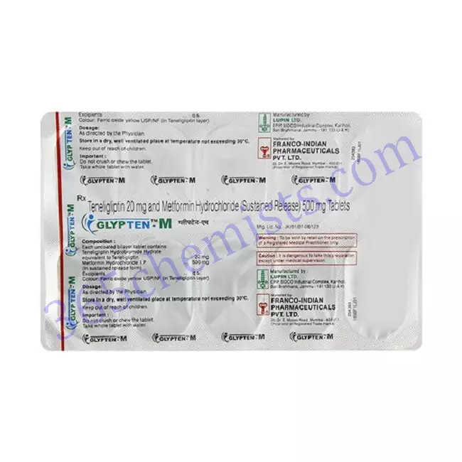 Teneligliptin in Glypten M Tablet works by increasing insulin secretion from the pancreas by inhibiting the enzyme dipeptidyl peptidase 4 (DPP4), whereas Metformin decreases the production of glucose from the liver, the amount of glucose absorbed from the intestine and increases insulin sensitivity.