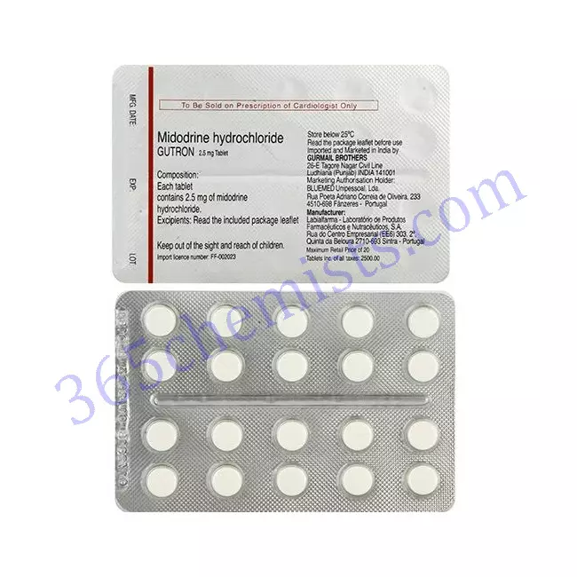 Midodrine hydrochloride is the active component in the medicine known as Gutron 2.5mg Tablet. This medication comes in tablet form. It is classified as a member of the group of medications called selective alpha-1 adrenergic agonists. A condition known as orthostatic hypotension, which is characterised by a sudden drop in blood pressure upon standing up, is the most common indication for the administration of midodrine as a treatment. In the following paragraphs, we will provide a comprehensive overview of Gutron 2.5mg Tablet, including its applications, mode of action, dosage, potential adverse effects, and safety considerations.